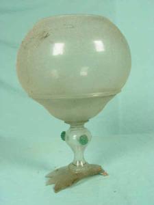 Grande calice con coppa emisferica decorata da un filo incolore applicato a circa un terzo della coppa, vicino alla parte inferiore. Stelo a balaustro cavo con tre more, in vetro verde smeraldo, applicate. Piede, in origine, probabilmente a disco. Segno del pontello.