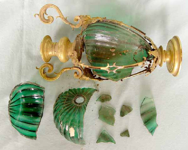 - NOTIZIE STORICO CRITICHE Il nostro vaso appartiene ad un gruppo di vetri, tra i quali figurano anche delle coppe ovali sagomate, in vetro acquamarina, sempre con montature in bronzo dorato, conservati nella collezione James Rotschild di Waddeson Manor e nella Galleria Regionale di Palazzo Abatellis a Palermo (CHARLESTON 1977, pp.128-129; BAROVIER MENTASTI 2001, pp. 252-253). Sono generalmente attribuiti alle vetrerie medicee di Firenze e di Pisa. Vetrerie volute dalla signoria medicea con il contributo fondamentale di alcuni maestri vetrai muranesi, chiamati a Firenze e ivi giunti a partire dal 1570 con Bortolo d'Alvise e più tardi, intorno al 1618 con Giacomo Luna. Il maestro muranese è chiamato da Cosimo II, che incarica Jacopo Ligozzi di disegnare alcuni vetri per le sua fornace, alcuni con montature in metallo come documentato da alcuni suoi disegni e da un dipinto, Fortuna, conservati agli Uffizi (ZECCHIN 1987, pp.131-147; HEIKAMP 1986, p.90, figg.74-75; p.137, fig.122; pp.275-276). Questi vasi colorati, di solito in vetro verde o azzurro, montati con fasce "in rame indorato", non sono per ora documentati nelle collezioni fiorentine ma sono citati nell'inventario del 1619 di Cosimo II , in quello del Granduca Ferdinando Secondo e nell'inventario dei mobili e masserizie del Principe Cardinale Leopoldo di Toscana del 1678 con la dicitura "vasi in vetro verde con manichi di rame dorato", taluni in forma di "serpe" (HEIKAMP 1986, p.272, p.370, pp.382-383).\nLa produzione di questo tipo particolare di manufatti vitrei si colloca tra la fine del Cinquecento fino ai primi decenni del Seicento. La loro datazione potrebbe essere spostata fino alla prima metà del XVII secolo, poiché in un dipinto di Giovanni Benedetto Castiglione, detto il Grechetto, Circe (fig. ), conservato agli Uffizi, datato intorno al sesto-settimo decennio del Seicento, è raffigurata una coppa ovale sagomata in vetro acquamarina con una montatura in rame dorato, molto simile agli esemplari di Waddeson Manor e di Palermo (La natura morta¿ 2003, pp. 320-321). La datazione del dipinto costituisce un'utile indicazione cronologica ante quem per la produzione di questi vetri. \nIl gusto che caratterizza questi oggetti vitrei è avvicinabile ai vasi di più piccole dimensioni in pietre dure e metalli, che nello stesso periodo uscivano dal laboratorio delle pietre dure di Firenze (BAROVIER MENTASTI 2001, pp. 252-253). Vasi analoghi sono disegnati nella Bichierografia (1604) di Giovanni Maggi, dedicata al cardinal Del Monte, che intratteneva stretti rapporti con i Medici (ZECCHIN 1987, p.149) .\nI vasi più simili al nostro pezzo, non solo per la parte in vetro verde, ma anche per il tipo di montatura in rame dorato, sono conservati nelle Civiche Raccolte d'Arte Applicata del Castello Sforzesco di Milano (MORI 1996, p.78).\nAltri pezzi in vetro verde, incolore e acquamarina, con differenti tipologie di montature in bronzo appartengono a diverse collezioni pubbliche: al Museo Poldi Pezzoli di Milano (MARIACHER, ROFFIA 1983, p.238, n. 98); alle Civiche Raccolte d'Arte Applicata di Milano (MORI 1996, p.77); all'Istituto di Archeologia dell'Università di Catania (ZECCHIN 1987, p.149); alla collezione James Rotschild di Waddeson Manor (CHARLESTON 1977, pp.138-139); al British Museum di Londra (TAIT 1979, pp.111, n. 183); alle Kunstsammlungen der Veste Coburg (THEUERKAUFF LIEDERWALD 1994, ); al Museo Civico di Torino (MALLÉ 1971, n.68).\nIl nostro pezzo è citato nell'Atto di Donazione del 1937 al n. 1 della sezione oreficerie: " Due vasi in vetro verde montate in bronzo dorato, lavoro di oreficeria romana dei primi del sec.XVII appartenente all'arredo d'altare di Papa (Borghese).