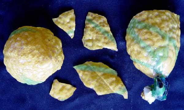 Limone in vetro giallo e striature verdi, incamiciato nel vetro cristallo; mora in vetro giallo, che era il pistillo del fiore in vetro lattimo del limone, ora frammentario; perduta anche la foglia verde, della quale rimangono alcune tracce.
