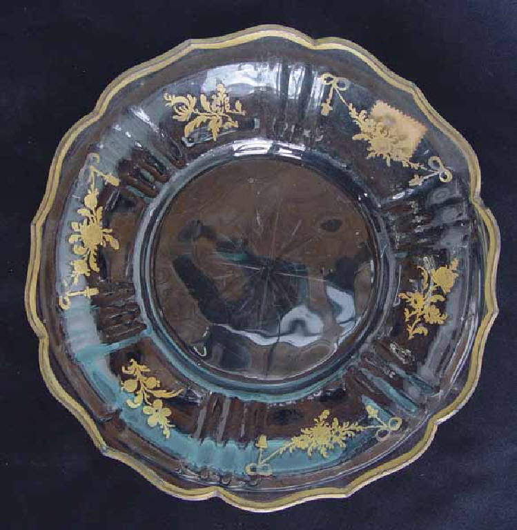 - NOTIZIE STORICO CRITICHE L'uso di profili dorati e di motivi decorativi, si ritrovano in diversi vetri prodotti nell'ultimo quarto del Settecento in diverse regioni europee: in Spagna, alla Granja de San Idelfonso, dove si producevano vetri decorati all'oro, anche con motivi a ghirlanda (CARRERAS ROSSEL, DOMÉNECH VIVES 2004, p.140, n.263; Real Fabrica de Cristales¿1991, p. 72, n.10); a Murano, nel Museo Vetrario sono conservati alcuni vetri dipinti con l'oro come un cassone da viaggio contenente bottiglie e bicchieri sfaccettati e decorati con motivi in oro (Mille anni¿ 1982, p. 208, n. 370), una compostiera in vetro molto leggero e un bicchiere decorati con motivi in oro simili a quelli del nostro pezzo (inv. cl.VI 652/6; cl.VI 652); in Boemia, a quest'area sono attribuiti una bottiglia e un bicchiere, ambedue con molature verticali e con decorazioni all'oro, con motivi a ghirlanda e con cordoni, datati all'inizio dell'Ottocento e conservati nel Gewerbemuseum di Nurberg (BORNFLETH 1985, n.63) decorazioni in oro con motivi naturalistici e cordoni decorano una bottiglia in vetro lattimo del Passauer Glassmuseum (Das Böhmische¿ 1995, vol. I, p.74, n.1.53).\nBicchieri con bordo in oro e motivi a ghirlanda e fiori in oro e smalti sono nel Museo Davia Bargellini di Bologna (OMODEO 1970, p. 151, fig.7);\nUn altro confronto possibile è con un sevizio di piattini che rivela alcune assonanze con il nostro pezzo nel motivo del bordo ondulato a punte decorato con l'oro, dei Musei Civici di Cremona, datato all'ultimo quarto del XVIII secolo, senza alcuna indicazione sull'area di produzione (MININI 2004, p.150, n.194). Un bicchiere conservato sempre nella collezione Pogliaghi presenta delle decorazioni a ghirlanda in oro simili (scheda di catalogo inv. n.963).\nAllo stato attuale degli studi risulta pertanto difficile attribuire con certezza il nostro piatto ad un'area geografica precisa.\nIl pezzo è citato nell'Atto di Donazione del 1937 al n.4 "Cinque piatti di cristallo molato, bordo festonato e decorazione diramoscelli fiorati: Venezia Sec. XVIII. Lire 150". In origine quindi i piatti erano cinque ne è rimasto solo uno