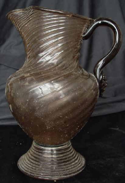 - NOTIZIE STORICO CRITICHE La brocca fa parte di un servizio corredato da due calici che si ispirano agli antichi Römer d'area tedesca (inv.207-208). Appartiene alla produzione muranese degli ultimi decenni del XIX secolo sia per il colore del vetro sia per le caratteristiche formali. Si ispira nella forma ad originali del cinque-seicento di area veneziana dei quali imita in modo particolare il motivo del mascherone a forma di leone applicato alla base dell'ansa, motivo che si ritrova in alcuni soffiati del Cinquecento: in una brocca del Museo Vetrario di Murano (Mille anni¿ 1982, p.114, n.137) e in un'altra, a retortoli, dei Musei Civici di Cremona (MININI 2004, p. 144, n.188). Da questi modelli se ne discosta ampiamente sia per il motivo a rigadin retorto che per quello dei fili avvolti che caratterizzano alcuni vetri ottocenteschi, come una brocca, con un'ansa diversa, della Salviati dott.Antonio (I colori¿ 1999, p.87, n.33).