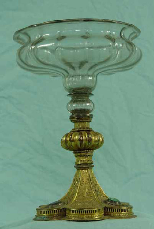 Coppa sagomata percorsa da costolature ad andamento verticale ottenute con la soffiatura a stampo con orlo della bocca estroflesso. Al di sotto della base vi è un nodo costolato. E' inserita su di piedistallo, base di arredo sacro, in rame dorato, con due pietre vitree, una verde chiaro e l'altra rossa. Segno del pontello all'interno della coppa