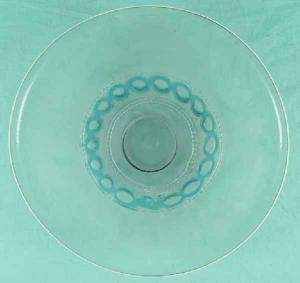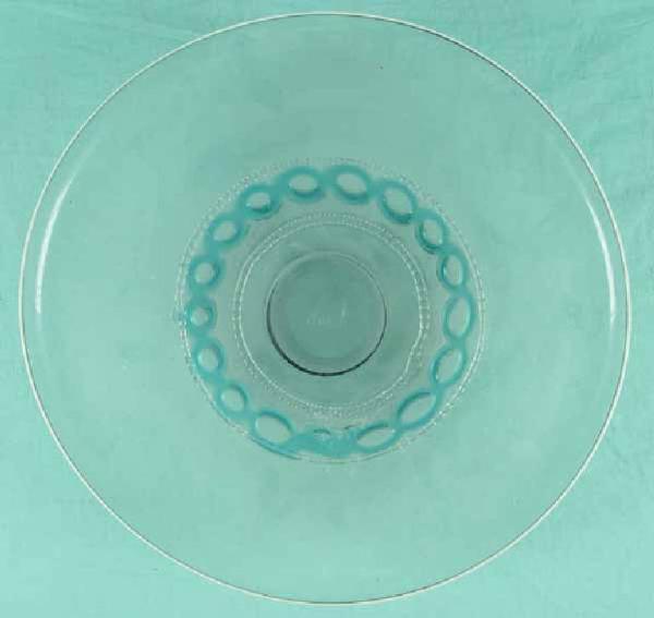 Sottocoppa decorata al centro da un motivo a catenella in vetro azzurro racchiusa da un filo incolore pizzicato ad andamento circolare, ripetuto all'interno della catenella. Filo di lattimo applicato sull'orlo esterno. Il piede è a tromba rovesciata con bordo ripiegato internamente e filo di vetro incolore applicato a metà del corpo.Segno del pontello.