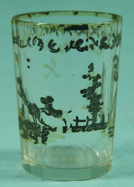 Bicchiere troncoconico con molature verticali sul corpo. Su lato sono raffigurati dei cani che saltano ed un uccello su di un tronco d'albero, dipinti con l'oro. L'orlo è decorato con una fascia dorata ed è molato.