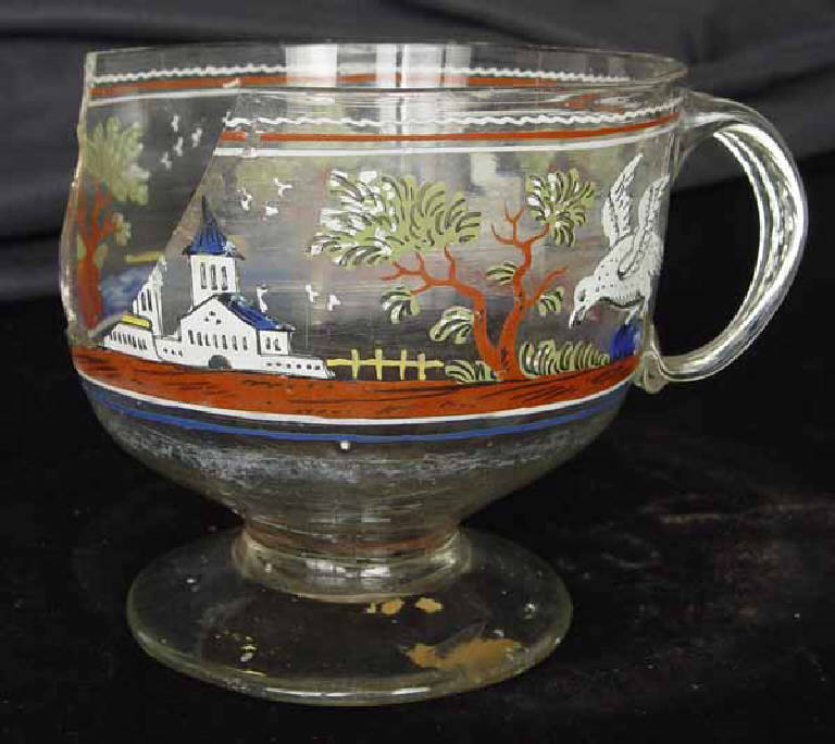 Coppa sulla quale sono raffigurati diversi soggetti a smalti rossi, blu, bianchi: un uomo su una barca, un castello, un rapace, che stringe qualcosa di blu, una chiesa, forse un convento, e degli alberi con fronde. Piede applicato. Originariamente le anse dovevano essere due decorate con costolature disposte in senso verticale seguendo l'andamento dell'ansa. Segno del pontello