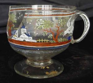 - NOTIZIE STORICO CRITICHE Il nostro pezzo appartiene alla produzione dell'Europa centrale del Settecento, che predilige in questo periodo i cristalli incolori molati, ma che vede il perpetuarsi di vetri decorati a smalto dallo stile più popolare e naif rispetto a quello della tradizione cinquecentesca (LIEFKES 1997, pp.61-62). Avvicinabili al nostro pezzo, sono due bicchieri con decorazioni a smalto, uno con la raffigurazione di un cavallo e l'altro con un uccello, riferibili alla produzione dell'Europa centrale, datati al XVIII secolo, conservati nel Rijksmuseum di Amsterdam (RITZEMA VAN ECK, ZIJLSTRA ZWEENS, 1993, p.275, nn.380-381) ed un terzo, per il motivo dell'uccello che stringe tra gli artigli un oggetto, già nella collezione Rudolph von Strasser, attribuito alla Slesia o alla Boemia e datato tra 1680 e 1770 (STRASSER, BAUMGARTEN 2002, pp.112-113). \nIl pezzo è citato nell'atto di donazione del 1937 al n.68 "Coppa con anse e coperchio, decorata da smalti e paesaggio.Vetro di Murano. Sec. XVIII Lire 150"