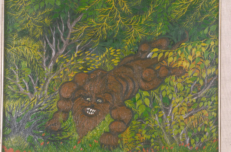 • NOTIZIE STORICO CRITICHE Soggetti come questo, ossia animali fantastici e feroci raffigurati in boschi dalla vegetazione rigogliosa, sono quelli ai quali Nerone si dedica quando comincia a dipingere nel 1972. \nCome sottolinea Mario De Micheli, essi incarnano il male di vivere (Lajolo D., De Micheli M., 1978).\n"Anche Nerone possiede dunque un suo bestiario come Ligabue o Covili, mentre però le belve di Ligabue in lotta tra di loro diventano soprattutto il traslato delle energie che pervadono la natura e gli animali di Covili fanno esclusivamente parte di una solida seppur drammatica realtà contadina, in Nerone acquistano quasi sempre il significato di presenze inquietanti, schernenti e allarmanti, quando non anche maligne e infernali (Lajolo D., De Micheli M., 1978).\nCommenti chiarificatori su questo genere di soggetto nella pittura di Nerone sono stati espressi anche da Renzo Margonari e Salvatore Maugeri ("Nerone", 1974). \nLa presenza, sul telaio di questo quadro, del timbro della Galleria Cortina - Palmieri di Milano testimonia che l'opera è stata presentata in una delle due mostre che questa galleria ha dedicato a Nerone: una nel 1974; una nel 1978. Dal momento che tra i cataloghi di proprietà di Angela Candiani vi è quello della mostra del 1974, è probabile che il dipinto abbia partecipato alla prima delle due esposizioni. Sul vetro che protegge il dipinto è ancora incollato un bollino adesivo con il numero 13 segnato a penna, che potrebbe essere la numerazione data allora ai lavori presentati in galleria.\nLa partecipazione alla mostra della Galleria Cortina - Palmieri aiuta a datare l'opera tra il 1972 e il 1974. Tra l'altro essa è molto simile ad una che è pubblicata in catalogo, datata 1973 (Nerone, 1974).