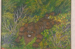 Animale fantastico di colore marrone, in corsa in mezzo alla vegetazione.