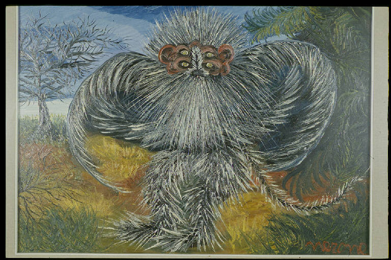 Bosco con mostro alato con lunghi peli grigi, muso rosso e due paia di occhi; il mostro occupa quasi interamentela scena