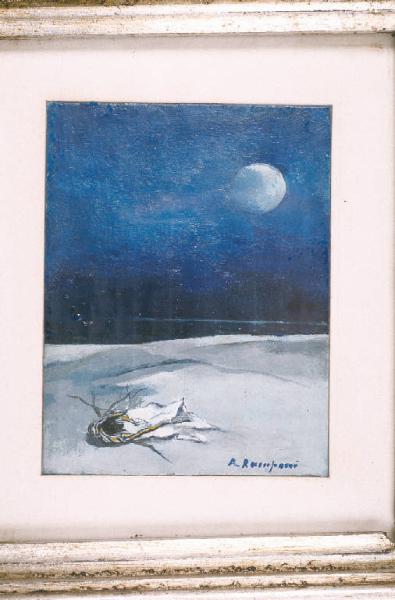 - NOTIZIE STORICO CRITICHE Il piccolo quadro sembra far parte di una serie di dipinti realizzati nel 1973 che hanno tutti come soggetto la spiaggia di notte, con la luna e con rami o nidi sulla sabbia (De Micheli 1974). \nLa data della sua esecuzione sarebbe quindi vicina a quella di questa serie, situandosi in un periodo in cui la Ramponi, abbandonati i temi sociali del realismo, si sposta su tematiche di carattere più intimista ed esistenziale.