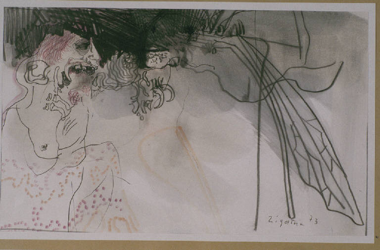 - NOTIZIE STORICO CRITICHE La data di questo disegno, un 1972 corretto in 1973, lo colloca vicino ai cicli della "Visitazione", che ha inizio a partire dal 1972, e di "Dal colle di Redipuglia" (l'enorme cimitero che raccoglie le spoglie dei morti della prima guerra mondiale), del 1973. \nLa costruzione del disegno, con l'ala di un grosso insetto sulla destra e la figura umana collocata in verticale lungo il lato sinistro del foglio lo avvicinano in particolar modo ai disegni intitolati "Visitazione".\nIl tema è quello della morte e della decomposizione del corpo che, nello stesso tempo, è alimento per diverse forme di vita, animali e vegetali. Gli insetti depongono le loro uova tra crani, mascelle, ossa, "simbolo della nascita di ogni cosa vivente dalla morte, dal sangue, dall'urina" (Haftman 1974).\nTutti i lavori dei cicli sopra elencati parlano "di un Friuli notturno con le ombre e le voci mormoranti della sua storia, voci che dal colle di Redipuglia raccontano il dolore della stirpe umana a intendere l'eterna ferita del mondo" (Haftman 1974). \nSull'opera grafica di Zigaina con questo genere di soggetti si veda anche Tassi 1990.