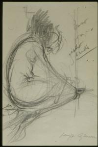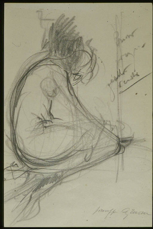 - NOTIZIE STORICO CRITICHE Lo stato di abbozzo, col tratto di matita più volte ripassato e corretto, e l'indicazione, a destra della figura, dei colori pensati per completare l'opera (bruno, grigio, giallo, verde) rivelano chiaramente che il disegno è uno studio per un dipinto.\nA proposito della abbondante produzione di disegni in funzione di abbozzi da parte dell'artista, interessante è quanto espresso da Ajmone stesso in un'intervista con Giuseppe Bonini che introduce il catalogo di un'antologica del pittore (Palazzo dei Diamanti, Ferrara, 1984). Qui egli parla diffusamente del passaggio dallo schizzo, che reputa come qualcosa facilmente "funziona", al dipinto su tela, in cui l'introduzione del colore aziona un meccanismo che procede quasi secondo una propria logica, in cui il pittore deve essere pronto a cogliere i suggerimenti offerti dai colori stessi, dai loro rapporti e dalla loro stesura. A testimonianza poi del valore attribuito dall'artista a disegni e abbozzi, in conclusione di questo discorso egli sostiene: "Mi piacerebbe molto stendere una grandissima tela in grado di raccogliere tutti gli studi preparatori e poi allestire una mostra in cui sia documentata l'intera operazione. Tutto il lavoro sotteso a un'opera d'arte non viene esposto molto spesso e, anzi, rimane nascosto, censurato alla vista" (Bonini, 1997, pp. 83-84).\nQuanto al tema del nudo femminile, esso è preponderante nel lavoro di Ajmone e molti sono i critici che hanno scritto sull'argomento, da Marco Valsecchi a Vittorio Fagone, Dino Buzzati, Giorgio Mascherpa, Roberto Tassi. \nDavide Lajolo, che aveva conosciuto Ajmone nei primi anni del dopoguerra, quando il pittore collaborava con la Casa Editrice Einaudi e poi con il "Politecnico" accanto a Pavese, scrive: "La sua musa è monocorde (si può anche scherzare con Ajmone). Un nudo di donna, poi ancora un nudo di donna, sempre più rarefatti nell'aria, ombre, larve, ostinato a raggiungere la perfezione." (Lajolo, 1984, p. 145).\nImportante poi, è, ancora una volta, la testimonianza dell'artista stesso, contenuta in una sua lettera al gallerista Giulio Bergamini in cui ricorda le riflessioni intorno al corpo e alla sua fascinazione, scaturite, in un'aula di studio dell'accademia milanese, dal confronto tra i corpi perfetti dei calchi in gesso e quelli, imperfetti, dei modelli in carne ed ossa. "(...) quello che posso fare è testimoniare del tenero interesse che quel corpo continua ad esercitare sul mio lavoro da quel lontano 1941, approfittando subdolamente anche della mia paranoica ostinazione" (Bonini, 1997, pag. 84).