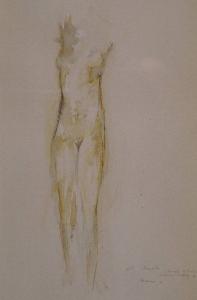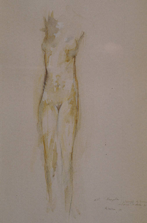 - NOTIZIE STORICO CRITICHE Si tratta di uno dei numerosi studi di nudo femminile eseguiti da Ajmone che la collezione Lajolo possiede, tutti datati tra il 1965 e la fine degli anni '70, e in gran parte molto vicini, per le pose e l'impianto della figura, alla serie di dipinti di nudi esposti alla Galleria Bergamini di Milano nel 1971. Questo disegno in particolare è molto simile a due pubblicati in catalogo, entrambi datati 1970 (Fagone, 1971).\nIl corpo femminile viene spesso ridotto dall'artista ad un "eroso troncone" - per usare una definizione che ben si adatta a questo disegno della collezione Lajolo - e si presenta come una "figura-sagoma dolcemente divorata dalla luce e dal tono" (Chiappatti, 1997, pp. 20, 21).\nA proposito della abbondante produzione di disegni preparatori da parte dell'artista, interessante è quanto espresso da Ajmone stesso in un'intervista con Giuseppe Bonini che introduce il catalogo di un'antologica del pittore (Palazzo dei Diamanti, Ferrara, 1984). Qui egli parla diffusamente del passaggio dallo schizzo, che reputa come qualcosa facilmente "funziona", al dipinto su tela, in cui l'introduzione del colore aziona un meccanismo che procede quasi secondo una propria logica, in cui il pittore deve essere pronto a cogliere i suggerimenti offerti dai colori stessi, dai loro rapporti e dalla loro stesura. A testimonianza poi del valore attribuito dall'artista a disegni e abbozzi, in conclusione di questo discorso egli sostiene: "Mi piacerebbe molto stendere una grandissima tela in grado di raccogliere tutti gli studi preparatori e poi allestire una mostra in cui sia documentata l'intera operazione. Tutto il lavoro sotteso a un'opera d'arte non viene esposto molto spesso e, anzi, rimane nascosto, censurato alla vista" (Bonini, 1997, pp. 83-84).\nQuanto al tema del nudo femminile, esso è preponderante nel lavoro di Ajmone e molti sono i critici che hanno scritto sull'argomento, da Marco Valsecchi a Vittorio Fagone, Dino Buzzati, Giorgio Mascherpa, Roberto Tassi. \nDavide Lajolo, che aveva conosciuto Ajmone nei primi anni del dopoguerra, quando il pittore collaborava con la Casa Editrice Einaudi e poi con il "Politecnico" accanto a Pavese, scrive: "La sua musa è monocorde (si può anche scherzare con Ajmone). Un nudo di donna, poi ancora un nudo di donna, sempre più rarefatti nell'aria, ombre, larve, ostinato a raggiungere la perfezione." (Lajolo, 1984, p. 145).\nImportante poi, è, ancora una volta, la testimonianza dell'artista stesso, contenuta in una sua lettera al gallerista Giulio Bergamini in cui ricorda le riflessioni intorno al corpo e alla sua fascinazione, scaturite, in un'aula di studio dell'accademia milanese, dal confronto tra i corpi perfetti dei calchi in gesso e quelli, imperfetti, dei modelli in carne ed ossa. "(...) quello che posso fare è testimoniare del tenero interesse che quel corpo continua ad esercitare sul mio lavoro da quel lontano 1941, approfittando subdolamente anche della mia paranoica ostinazione" (Bonini, 1997, pag. 84).