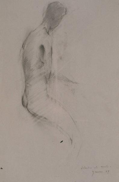 - NOTIZIE STORICO CRITICHE Si tratta di uno dei numerosi studi di nudo femminile eseguiti da Ajmone che la collezione Lajolo possiede, tutti datati tra il 1965 e la fine degli anni '70, e in gran parte molto vicini, per le pose e l'impianto della figura, alla serie di dipinti di nudi esposti alla Galleria Bergamini di Milano nel 1971. Questo disegno in particolare è molto simile a quattro dei dipinti pubblicati in catalogo, raffiguranti una donna seduta, tutti datati 1970 (Fagone, 1971). \nInteressante è anche la somiglianza tra la tecnica disegnativa e quella pittorica, che Paride Chiappatti descrive "al limite della gestualità; (...). Un gesto contraddittorio che costruisce l'immagine e, nel contempo, la cancella" (Chiappatti, 1997, p. 19).\nA proposito della abbondante produzione di disegni preparatori da parte dell'artista, interessante è quanto espresso da Ajmone stesso in un'intervista con Giuseppe Bonini che introduce il catalogo di un'antologica del pittore (Palazzo dei Diamanti, Ferrara, 1984). Qui egli parla diffusamente del passaggio dallo schizzo, che reputa come qualcosa facilmente "funziona", al dipinto su tela, in cui l'introduzione del colore aziona un meccanismo che procede quasi secondo una propria logica, in cui il pittore deve essere pronto a cogliere i suggerimenti offerti dai colori stessi, dai loro rapporti e dalla loro stesura. A testimonianza poi del valore attribuito dall'artista a disegni e abbozzi, in conclusione di questo discorso egli sostiene: "Mi piacerebbe molto stendere una grandissima tela in grado di raccogliere tutti gli studi preparatori e poi allestire una mostra in cui sia documentata l'intera operazione. Tutto il lavoro sotteso a un'opera d'arte non viene esposto molto spesso e, anzi, rimane nascosto, censurato alla vista" (Bonini, 1997, pp. 83-84).\nQuanto al tema del nudo femminile, esso è preponderante nel lavoro di Ajmone e molti sono i critici che hanno scritto sull'argomento, da Marco Valsecchi a Vittorio Fagone, Dino Buzzati, Giorgio Mascherpa, Roberto Tassi. \nDavide Lajolo, che aveva conosciuto Ajmone nei primi anni del dopoguerra, quando il pittore collaborava con la Casa Editrice Einaudi e poi con il "Politecnico" accanto a Pavese, scrive: "La sua musa è monocorde (si può anche scherzare con Ajmone). Un nudo di donna, poi ancora un nudo di donna, sempre più rarefatti nell'aria, ombre, larve, ostinato a raggiungere la perfezione." (Lajolo, 1984, p. 145).\nImportante poi, è, ancora una volta, la testimonianza dell'artista stesso, contenuta in una sua lettera al gallerista Giulio Bergamini in cui ricorda le riflessioni intorno al corpo e alla sua fascinazione, scaturite, in un'aula di studio dell'accademia milanese, dal confronto tra i corpi perfetti dei calchi in gesso e quelli, imperfetti, dei modelli in carne ed ossa. "(...) quello che posso fare è testimoniare del tenero interesse che quel corpo continua ad esercitare sul mio lavoro da quel lontano 1941, approfittando subdolamente anche della mia paranoica ostinazione" (Bonini, 1997, pag. 84).
