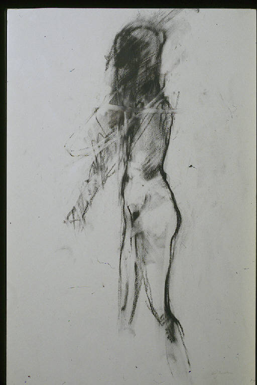 - NOTIZIE STORICO CRITICHE Si tratta di uno dei numerosi studi di nudo femminile eseguiti da Ajmone che la collezione Lajolo possiede, tutti datati tra il 1965 e la fine degli anni '70, e in gran parte molto vicini, per le pose e l'impianto della figura, alla serie di dipinti di nudi esposti alla Galleria Bergamini di Milano nel 1971 (Fagone, 1971). \nInteressante è anche la somiglianza tra la tecnica disegnativa e quella pittorica, che Paride Chiappatti descrive "al limite della gestualità; (...). Un gesto contraddittorio che costruisce l'immagine e, nel contempo, la cancella" (Chiappatti, 1997, p. 19).\nA proposito della abbondante produzione di disegni in funzione di abbozzi da parte dell'artista, interessante è quanto espresso da Ajmone stesso in un'intervista con Giuseppe Bonini che introduce il catalogo di un'antologica del pittore (Palazzo dei Diamanti, Ferrara, 1984). Qui egli parla diffusamente del passaggio dallo schizzo, che reputa come qualcosa facilmente "funziona", al dipinto su tela, in cui l'introduzione del colore aziona un meccanismo che procede quasi secondo una propria logica, in cui il pittore deve essere pronto a cogliere i suggerimenti offerti dai colori stessi, dai loro rapporti e dalla loro stesura. A testimonianza poi del valore attribuito dall'artista a disegni e abbozzi, in conclusione di questo discorso egli sostiene: "Mi piacerebbe molto stendere una grandissima tela in grado di raccogliere tutti gli studi preparatori e poi allestire una mostra in cui sia documentata l'intera operazione. Tutto il lavoro sotteso a un'opera d'arte non viene esposto molto spesso e, anzi, rimane nascosto, censurato alla vista" (Bonini, 1997, pp. 83-84).\nQuanto al tema del nudo femminile, esso è preponderante nel lavoro di Ajmone e molti sono i critici che hanno scritto sull'argomento, da Marco Valsecchi a Vittorio Fagone, Dino Buzzati, Giorgio Mascherpa, Roberto Tassi. \nDavide Lajolo, che aveva conosciuto Ajmone nei primi anni del dopoguerra, quando il pittore collaborava con la Casa Editrice Einaudi e poi con il "Politecnico" accanto a Pavese, scrive: "La sua musa è monocorde (si può anche scherzare con Ajmone). Un nudo di donna, poi ancora un nudo di donna, sempre più rarefatti nell'aria, ombre, larve, ostinato a raggiungere la perfezione." (Lajolo, 1984, p. 145).\nImportante poi, è, ancora una volta, la testimonianza dell'artista stesso, contenuta in una sua lettera al gallerista Giulio Bergamini in cui ricorda le riflessioni intorno al corpo e alla sua fascinazione, scaturite, in un'aula di studio dell'accademia milanese, dal confronto tra i corpi perfetti dei calchi in gesso e quelli, imperfetti, dei modelli in carne ed ossa. "(...) quello che posso fare è testimoniare del tenero interesse che quel corpo continua ad esercitare sul mio lavoro da quel lontano 1941, approfittando subdolamente anche della mia paranoica ostinazione" (Bonini, 1997, pag. 84).