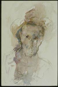 Busto di uomo con cappello; tono rossastro e tocchi di colore blu