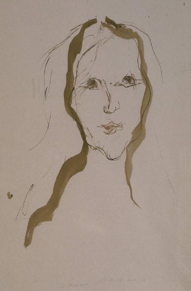 - NOTIZIE STORICO CRITICHE Questo disegno compare, insieme ad altri (NSK 61, 64), ad illustrazione di un lungo articolo di Davide Lajolo su Ernesto Treccani pubblicato nel 1972 sul settimanale "Giorni Vie Nuove", di cui Lajolo era allora direttore. Lo scritto si inserisce nella rubrica "Incontri con i personaggi", nella quale il giornalista era solito tracciare il ritratto di uno degli artisti cui era legato in amicizia, narrandone la persona e la poetica. \nNell'articolo Lajolo si sofferma anche sul soggetto dei ritratti, laddove parla della necessità dell'artista di disegnare seppur ricoverato in clinica in seguito ad un incidente (maggio 1972): "Ma se non veniva il sonno ecco il volto delle infermiere, i ricordi di volti lontani e sui fogli bianchi le fisionomie, i sorrisi, gli occhi come incanto, quelle figure leggere che Treccani dipinge in modo inconfondibile dove non conta molto la somiglianza dei tratti ma conta la scoperta della loro tenerezza interiore." (Lajolo, 1972).\nI disegni che accompagnano l'articolo sono indicati come "alcuni dei più recenti disegni di Ernesto Treccani", fatto che aiuta a collocare nel tempo questo lavoro, non datato, della collezione Lajolo.\nL'opera presenta le caratteristiche dei lavori eseguiti dopo i fatti d'Ungheria del 1956, che segnano nell'evoluzione artistica di Treccani il passaggio dai temi sociali e dai modi espressionistici ad un nuovo sentimento lirico per la natura e per la figura umana che si esprime con un linguaggio quasi informale, soprattutto attraverso le tecniche rapide del disegno e dell'acquerello. \nL'acquerello in particolare, secondo Raffaele De Grada è stato rilanciato da Treccani in un periodo in cui quasi tutti se ne erano allontanati: negli artisti migliori del '900 "l'acquarello si è accompagnato a una intenzione culturale, è un mezzo per studiare con la resa totale immediata il rapporto tra stato d'animo e visione, con la rapidità che non ammette pentimenti ma nel contempo la fluidità che trova un ordine inaspettato, poco consono alla fatica dell'elaborazione dell'olio e alla acidità del colore acrilico. Treccani acquarellista si colloca perfettamente in questa tradizione (...)." (De Grada 1989).\nTutto questo con un segno che "detesta la linea retta, ricama, insegue ellissi o labirinti (...) nel suo andamento appare spesso malcerto, ambiguo, elude le distinzioni nette, tradisce l'interno tremore di "un'invariazione simbolica", quasi un ritegno della mano nel prendere partito di fronte al reale." (De Santi 1989).\nQuanto al soggetto dei ritratti e dei volti, scrive Luciano Luisi: "E' il modo di Treccani (di quest'uomo che ha fatto della sua vita un impegno totale e coerente), di partecipare attivamente alla vita degli altri. Per questo i ritratti, i volti sono il motivo ricorrente (il riproporsi di una fedeltà spirituale) della sua opera fin dagli inizi; perchè così Treccani assolva la sua vocazione di essere dentro l'uomo, che è il modo più alto di essere dentro la pittura e dentro la società." (Luisi, 1975).\nSui ritratti di Treccani ha scritto anche Leonardo Capano, notando come essi non fissino in termini naturalistici i lineamenti del modello, la sua "singolarità", perchè eseguiti con alcune costanti che "mettono in rapporto": "Così in un volto si riflettono "più immagini" (...)". Al di là poi delle diversità pittoriche con cui i ritratti di Treccani vengono eseguiti, si tratta di immagini "che non sono mai semplicemente descrittive ma tendono piuttosto a dissolversi, fino al limite dell'astrazione." (Capano, 1989).