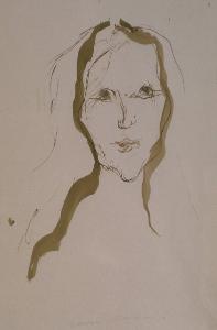 Pochi e veloci tratti di inchiostro color seppia delineano il volto affilato di una giovane donna con i capelli lunghi, sciolti sulle spalle; labbra, profilo del naso e occhi sono tratteggiati leggermente anche con la matita colorata (blu per gli occhi, rosa per il profilo del naso e per le labbra).
