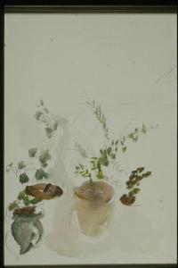 - NOTIZIE STORICO CRITICHE Il soggetto di questo disegno si inserisce in quell'analisi che Treccani, fin dal suo esordio come pittore, conduce sulle piccole cose che circondano la vita quotidiana dell'uomo (conchiglie, tegami, lampadine, scarpe).\nL'attenzione verso questo genere di soggetti diventa però frequente soprattutto a partire dal 1956, quando gli eventi politici, e i fatti d'Ungheria in particolare, segnano nella sua evoluzione artistica il passaggio dai temi sociali e dai modi espressionistici ad un nuovo lirismo naturalista, che si esprime con un linguaggio quasi informale, fatto di pochi e veloci tratti e tocchi di colore.\nScrive Leonardo Capano: "Ciò che rende interessanti queste immagini non sono tanto i risultati in sè ma l'esplicitazione di un metodo di lavoro e di conoscenza su cui si fonda tutto l'operare di Treccani: cioè l'esercizio continuo di indagine della verità delle cose, il desiderio di imparare a comunicare con l'oggetto, a guardarlo per conoscerlo." (Capano 1989).\nSi tratta di rappresentazioni che, come nota Luisi, "muovendo da un iniziale impressionismo" possono volgere ad un "espressionismo drammatico", perchè dettate dal timore che quelle apparenze si dissolvano: "Nasce da questo stato d'animo, da questa volontà di recupero, anche quella di salvare la natura nella sua verità oggettiva, nascono le siepi, i fiori, le immagini che l'artista ha intitolato "Il giardino splendente"." (Luisi, 1975).\nSecondo De Micheli, l'interesse e la partecipazione di Treccani ai problemi e alla vita degli uomini, espliciti nella fase della pittura realista, non sarebbero scomparsi con l'emergere della sua sensibilità verso la realtà naturale: essa infatti "non è per lui un puro e innocente luogo d'evasione, in cui cercare riparo dalla brutalità della storia. Al contrario: nalla natura egli ritrova l'uomo e ne avverte l'aspirazione a un'esistenza non minacciata, a una condizione non oppressiva." (De Micheli 1989).\nTreccani stesso sostiene: "Vorrei che un giorno si potesse dire del mio lavoro: era in un tempo che andava verso la felicità malgrado le nubi e i flagelli. Di questi aveva coscienza, eppure ha dipinto un giardino splendente. Soltanto chi ha il cuore aperto alle sofferenze del mondo, chi conosce il significato di sfruttamento e servitù, chi risponde con la lotta, può aspirare ad esprimere la bellezza." (Treccani, 1966).\nLe tecniche più utilizzate da Treccani per esprimere il suo lirico sentimento della natura e degli oggetti quotidiani sono quelle, rapide, del disegno dell'acquerello.\nL'acquerello in particolare, secondo Raffaele De Grada è stato rilanciato da Treccani in un periodo in cui quasi tutti se ne erano allontanati: negli artisti migliori del '900 "l'acquarello si è accompagnato a una intenzione culturale, è un mezzo per studiare con la resa totale immediata il rapporto tra stato d'animo e visione, con la rapidità che non ammette pentimenti ma nel contempo la fluidità che trova un ordine inaspettato, poco consono alla fatica dell'elaborazione dell'olio e alla acidità del colore acrilico. Treccani acquarellista si colloca perfettamente in questa tradizione (...)." (De Grada 1989).\nTutto questo con un segno che "detesta la linea retta, ricama, insegue ellissi o labirinti (...) nel suo andamento appare spesso malcerto, ambiguo, elude le distinzioni nette, tradisce l'interno tremore di "un'invariazione simbolica", quasi un ritegno della mano nel prendere partito di fronte al reale." (De Santi 1989).