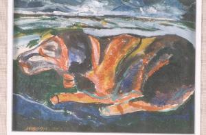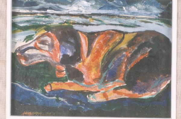 Cane accucciato, dipinto nei toni del rosso e del blu; la figura occupa quasi interamente la tela; sullo sfondo, paesaggio nei toni dell'azzurro e del verde