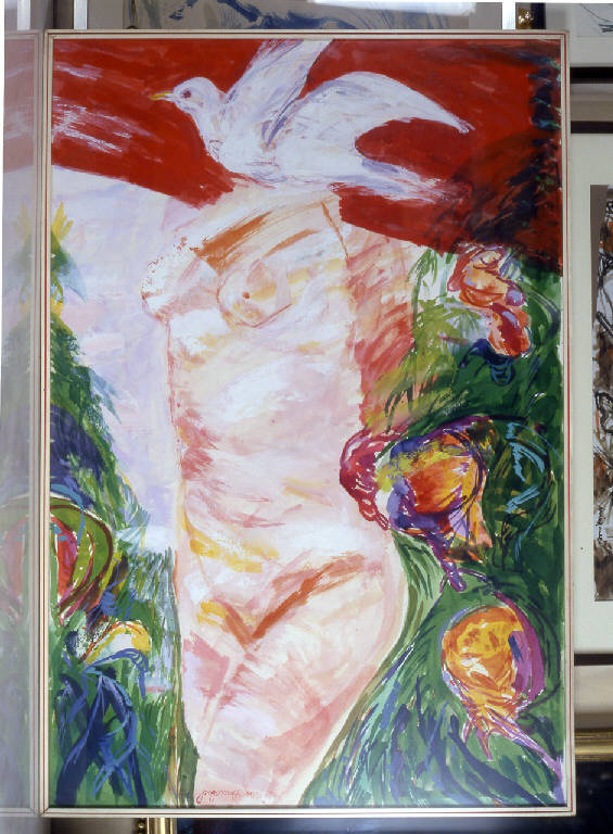 - NOTIZIE STORICO CRITICHE Angela Candiani ricordava questa tempera di Maffi come realizzata su ispirazione del romanzo di Davide Lajolo "Veder l'erba dalla parte delle radici", in cui la figura della colomba ha una parte centrale (2000, Angela Candiani, com. or.). Il romanzo tuttavia è stato pubblicato solo nel 1977, quattro anni dopo la realizzazione del dipinto. \nEsso per altro compare come illustrazione della copertina del numero del 25 aprile 1973 di "Giorni Vie Nuove", settimanale diretto da Davide Lajolo (giugno 1969 - luglio 1978). Come è spiegato in una nota di redazione relativa all'immagine, l'opera del pittore vuole simboleggiare allegoricamente la Resistenza e la Liberazione in occasione della festa del 25 aprile (Giorni Vie, 1973).\nAccadeva di frequente che, nel preparare il numero della rivista dedicato a questa festa nazionale, Lajolo coinvolgesse gli amici pittori per arricchirlo con disegni o dipinti che in alcuni casi venivano realizzati appositamente. Anche in questo caso, è probabile che la tempera di Maffi sia stata eseguita apposta, dal momento che si tratta di un soggetto atipico per il pittore. \nEgli ha infatti realizzato poche altre rappresentazioni di nudi femminili. Quelli noti, del 1975, sono raffigurati in modo quasi identico a quello di questa allegoria della Liberazione: con il corpo di tre quarti, tagliato nella parte bassa all'altezza delle ginocchia e nella parte alta a livello del collo, o comunque con la testa cancellata da bande di colore nero (Lajolo/ Munari/ Carlesi, 1980).\nLajolo, in uno scritto dedicato all'artista, si sofferma su questo tipo di soggetto, parlando di "nudi investiti dalla luce tenerissima dell'alba, dai colori del fiore di mandorlo, nudi in cui dal mare dei pensieri trascende la donna quasi incorporea eppure invitante" (Lajolo, 1973). \nLe parole dello scrittore sembrano prefigurare una sua poesia che l'anno seguente verrà pubblicata nella cartella "E' accaduto sul fiume", accompagnata da tre tempere di Maffi. Di questa cartella non sono state rintracciate le tempere, ma la poesia di Lajolo è una poesia d'amore, riferita ad una donna che, alla luce dell'alba,esce dall'acqua del fiume e dal ricordo per generare emozioni (Lajolo/ Maffi, 1974).\nVi è anche un altro caso in cui la figura femminile diviene protagonista del lavoro dell'artista: negli 11 disegni che illustrano le poesie di Dino Carlesi nel volume "Ottoletteredamore", del 1976. Le modalità della rappresentazione di Maffi, che sono molto simili a quelle del dipinto della collezione, vengono bene sottolineate da Pier Carlo Santini nel testo di presentazione della raccolta di poesie. Egli identifica tre elementi tipologici predominanti: la figura (o la testa) femminile; tralci, fogliame o bende; macchie, barre, scolature. "Nel linguaggio di Maffi la grafia sottile e quasi delicata degli episodi di ascendenza figurale si mescola ad interventi che sono come fulminee prorompenze di disperazione e di angoscia" (Lajolo/ Munari/ Carlesi, 1980).