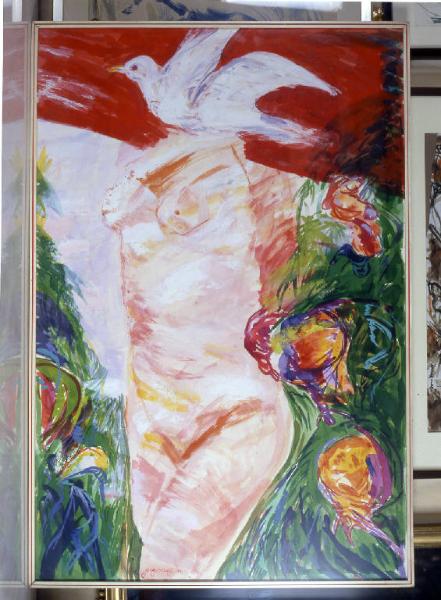 Corpo di donna nudo, rappresentato dalle ginocchia in su, privo di braccia, con una colomba bianca al posto della testa; dietro di essa, un drappo rosso, mentre sullo sfondo della figura, una folta vegetazione verde con fiori o frutti arancioni e viola