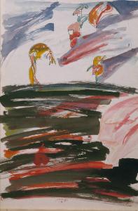Nella parte bassa del foglio, a destra, volto di uomo di profilo su fondo nero e rosso; in alto, figure colorate di rosso e giallo su fondo bianco e azzurro