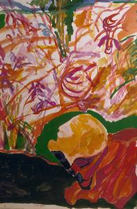 Paesaggio rappresentato con tratti di colore rosso e viola; in basso, figura metà uomo metà cane