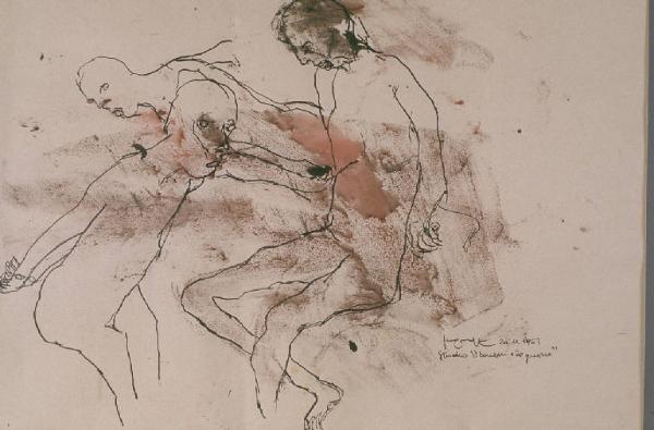 - NOTIZIE STORICO CRITICHE Il disegno risale a quella fase del lavoro di Maffi in cui la figura umana e le vicende degli uomini sono centrali nella sua pittura. \nIn particolare, esso fa quasi certamente parte della serie di disegni realizzati intorno al tema della sofferenza dei bambini, esposta nel 1963 in una mostra in cui Maffi, giovanissimo, è presentato da Raffaele De Grada.\nScrive De Grada: "Stilisticamente l'agitazione morale si esprime attraverso un segno nervoso, di inquieta ossessione e laddove è colorato, ci porta l'asprezza del sangue. In confronto a questi di Maffi, gli stessi disegni di Guttuso sembrano classici e, d'altro canto, le immagini di Vespignani affondano negli anfratti della cronaca. (...) Un ciclo di disegni che non son fatti per esercitare mano e fantasia, ma per compiere un dovere umano, quello che attendiamo dai giovani d'oggi, che possono superare la secca delle mode soltanto quando avranno la piena coscienza che ogni generazione consuma la sua parte di storia." (Lajolo/ Munari/ Carlesi, 1980).\nUno dei disegni presentati in quella mostra verrà pubblicato circa un decennio dopo all'interno del volume "Davide Lajolo Ugo Maffi", contenente nove poesie di guerra di Lajolo e nove disegni di Maffi (Lajolo/ Maffi, 1974). \nI disegni risalgono tutti al periodo tra il 1971 e il 1974, tranne quello intitolato "No! Al fascismo", l'unico pubblicato su due pagine, al centro del libro, che è del 1963: in esso, come in questo della collezione Lajolo, sono raffigurati dei prigionieri, alcuni con le braccia legate dietro la schiena; anche la tecnica d'esecuzione è la stessa, con i profili delle figure segnati a china e sbavature di colore acquoso.\n"I bambini e la guerra" è il più antico lavoro di Maffi presente nella collezione. Potrebbe avervi fatto il suo ingresso proprio in occasione della collaborazione di Lajolo con Maffi al libro citato. Le poesie dello scrittore sul tema della guerra e della lotta partigiana, risalenti a quel periodo della storia che Lajolo visse in prima persona, oltre ad essere state per Maffi lo spunto per nuovi disegni, si sarebbero anche incontrate con lavori da lui già realizzati in un periodo molto precedente. Di questi ultimi, uno potrebbe allora essere stato donato a Lajolo dall'artista.