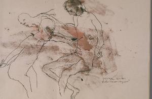 Tre figure profilate a china con le braccia legate dietro la schiena; sbavature di colore acquoso rosso-rosa