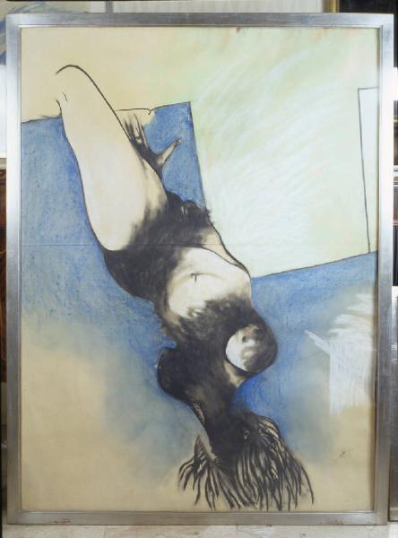 Nudo di donna capovolto con zone di ombra scura e zone di pelle scoperta (una coscia, un seno, il ventre); fondo azzurro con riquadro verde chiaro nella parte alta