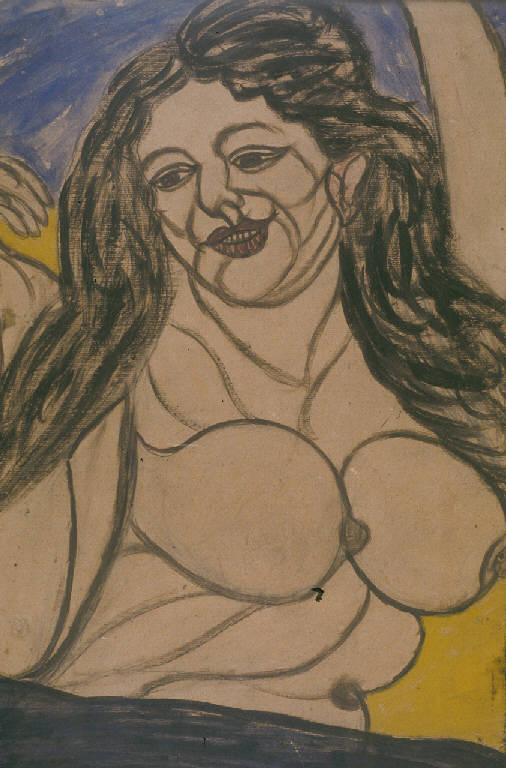 Busto-ritratto di donna nuda con capelli neri lunghi sulle spalle; la donna ha le braccia sollevate come in atto di stirarsi al momento del risveglio; in basso sembra di riconoscere il lembo scuro di una coperta che copre la parte bassa della figura; il fondo della parte centrale è di colore giallo, quello della parte superiore è azzurro; un tratto nero e scuro disegna e dettaglia l'intera figura