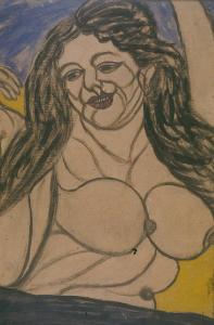 - NOTIZIE STORICO CRITICHE Il disegno rientra in quella parte della produzione di Ghizzardi più singolare ed apprezzata, che ritrae donne a seno scoperto raffigurate secondo le modalità ingenue e drammaticamente espressioniste tipiche dell'artista naif. \nSi tratta quasi certamente del ritratto di qualcuno che l'artista conosceva, come dimostra la forte caratterizzazione del viso dai lineamenti pesantemente marcati.\nScrive Lajolo: "(...) sempre stando con le pupille spalancate sui seni, Ghizzardi riusciva a dare forma agli occhi, al viso, alle mani, a fare il ritratto della donna quasi sempre somigliante anche se erano soprattutto i seni a definire per lui il carattere, i sentimenti, le voglie. Quadri rozzi per concezione, drammatici sempre. Un naif tragico" (Lajolo, 1973).\nIl brano è tratto da un articolo pubblicato nel 1973 su "Giorni Vie Nuove". In questo articolo il giornalista racconta l'incontro avvenuto con Ghizzardi a Boretto, dove egli si era recato apposta per conoscerlo, accompaganto da Marino Mazzacurati e da Cesare Zavattini. \nDal momento che l'esecuzione del disegno risale a diversi anni prima rispetto all'incontro tra Lajolo e Ghizzardi, quasi certamente esso è entrato a fare parte della collezione solo dopo l'inizio degli anni '70.\nL'applicazione su tela della carta difficilmente può essere avvenuta contestualmente all'esecuzione del disegno, in quanto in quel periodo l'artista, non ancora conosciuto, non aveva i mezzi per farlo. Essa può essere stata realizzata solo dalla fine degli anni '60 in poi, e Ghizzardi stesso ha potuto firmare il retro della tela a lavoro eseguito.