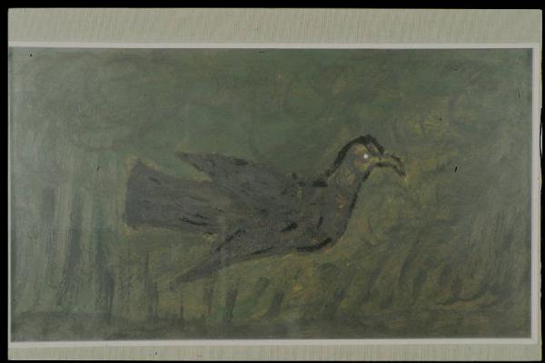 - NOTIZIE STORICO CRITICHE Il dipinto raffigura un soggetto frequente in tutta la pittura di genere naif: uno degli animali che popolano la terra abitata dal pittore, oggetto primo della sua osservazione e fonte diretta di ispirazione.\nSi tratta in questo caso di un uccello, che in diversi altri dipinti di Ghizzardi compare affiancato ad una belva feroce.\nCome scrive Lajolo, l'artista colloca la felicità "soltanto negli uccelli che sono liberi nell'aria", e trasferisce le sua rabbia nelle tigri, negli sciacalli e nelle bestie feroci. Lajolo riferisce che Ghizzardi avrebbe affermato di essere pittore di ritratti ma anche di galline, uccelli, fiori: "(...) io sono sempre immerso in questa terra, come fossi sepolto. Respiro, ma sono dentro le piante, nella pancia dei miei gatti, negli occhi delle mie colombe, nelle piume dei miei passerotti, sono ancora dentro il ventre di mia madre." (Lajolo, 1973).\nIl brano è tratto da un articolo pubblicato nel 1973 su "Giorni Vie Nuove". In questo articolo il giornalista racconta l'incontro avvenuto con Ghizzardi a Boretto, dove egli si era recato apposta per conoscerlo, accompaganto da Marino Mazzacurati e da Cesare Zavattini. \nSi può ipotizzare che il dipinto della collezione, eseguito dall'artista lo stesso anno in cui avvenne questo primo incontro, sia stato donato allo scrittore da Ghizzardi stesso in quell'occasione o comunque in un momento non molto lontano.