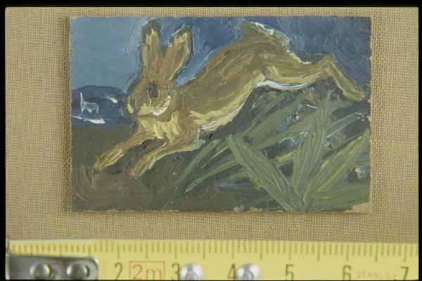 Lepre in atto di appoggiarsi a terra dopo il salto; cespuglio d'erba nell'agolo inferiore destro, casa o chiesa sullo sfondo a sinistra sotto un angolo di cielo azzurro