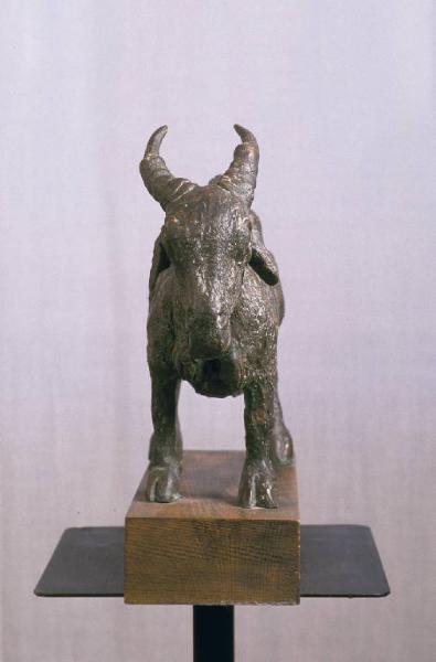 - NOTIZIE STORICO CRITICHE Angela Candiani reputava la scultura opera originale di Antonio Ligabue (2000, comunicazione orale).\nUna valutazione dell'opera da parte del Centro Studi e Archivio Antonio Ligabue (febbraio 2005) ha invece rivelato che si tratta di "un omaggio a Ligabue eseguito da un autore sconosciuto".\nAntonio Ligabue è autore di una serie di sculture, realizzate in creta tra il 1935 e il 1960 utilizzando la terra del fiume Po'. \nDi consistenza fragile e usate dall'artista come merce di scambio per ottenere del cibo, sono sopravvissute in un numero piuttosto scarso. Quelle rintracciate sul territorio emiliano presso le case della gente del luogo negli anni successivi alla morte di Ligabue, nel 1972 erano circa un centinaio. Trentotto di queste, tutte fuse in bronzo dagli originali in creta, vengono pubblicate quello stesso anno nel volume "Il bestiario di Ligabue scultore" (De Micheli, 1972). \nLe sculture di Ligabue infatti raffigurano quasi esclusivamente animali, che l'artista conosceva bene sia nella struttura anatomica che nei comportamenti, e attraverso i quali esprimeva i suoi umori contrastanti. Le bestie aggressive e in lotta tra loro esprimono i suoi malumori e le sue insofferenze; i cavalli, i tori, gli animali la cui potenza viene piegata alle necessità dell'uomo rappresentano l'ammirazione per la calma sopportazione della fatica. \nAccanto a questi, gli animali domestici, da cortile o da stalla. Tra essi, il volume pubblica una capra molto simile a questa della collezione Lajolo ma accucciata. \nE' probabile che l'esecuzione di questa scultura risalga agli anni di maggiore notorietà di Ligabue (1965-1980) e, in particolare, di Ligabue come scultore, compresi tra il 1972, anno di pubblicazione del volume di De Micheli sopra citato, e il 1980.