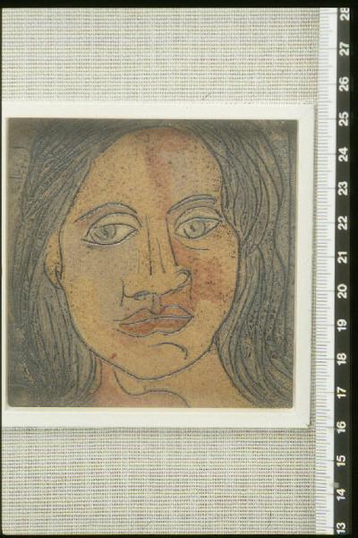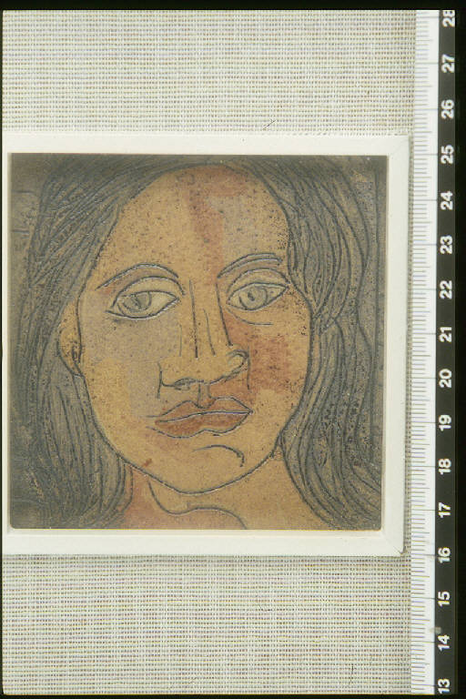 Volto di giovane donna con lunghi capelli sciolti; una linea nera incisa segna i lineamenti, i segni del volto, i capelli