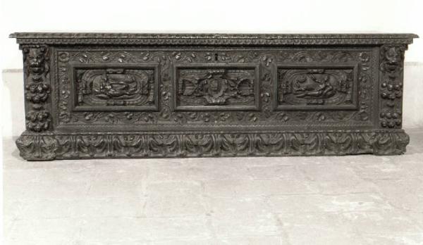 - NOTIZIE STORICO CRITICHE Il cassone presenta motivi decorativi ricorrenti dal sec. XVI al XVII nella tipologia toscana e veneta in particolare: frontale tripartito, fascia di pampini intorno ai tre pannelli frontali, le cui estremità racchiudono una figura giacente o uno stemma, alle estremità cariatidi o mascheroni. Questa particolare forma di cassone ed il motivo ornamentale della ninfa coricata entro cartiglio \nderivava dalla Scuola di Fontainbleu che produceva un'arte essenzialmente decorativa e manierista e dal 1550 aveva esercitato larga influenza sugli architetti dell'entroterra veneto che ben presto conobbero queste formelle decorative diffuse in tutta Italia, attraverso stampe incise tra il 1542 ed il 1547