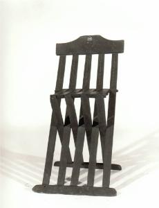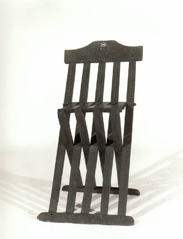 Sedia a cinque stecche, di legno intagliato (faggio ?), i sostegni formati da stecche si incrociano nei due sensi, munite di un perno permettono alla sedia di piegarsi, la parte superiore e la traversa leggermente sagomata e concludente il dorsale è ornata con fiore stilizzato intagliato o con minuta decorazione a cavetti simmetricamente disposti, lo stretto piano del sedile è collocato molto in alto.
