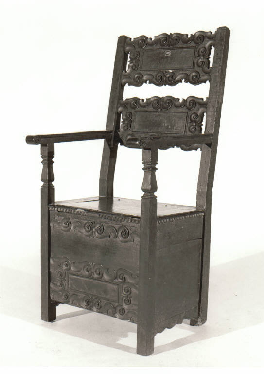 Sedia a cassa di massello scurito, frontale a giorno, decorato con due pesanti cartelle, intagliate con semplice specchiatura rettangolare a volute riunite, riprese nella parte inferiore del sedile, con piano ribaltabile, usato come ripostiglio, braccioli lisci e dritti, ricurvi nella parte terminale, poggiante su sostegni intagliati, fianchi e piedi di semplice fattura, intagliati grossolanamente nella parte posteriore.