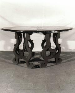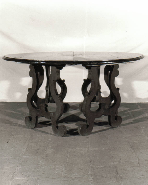 Tavolo da centro, circolare di massello coevo naturale, a due elementi accoppiati, con bordo modanato, sostegni "a lira" intagliati a pesanti volute poggianti su doppie traverse.