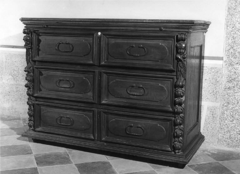 - NOTIZIE STORICO CRITICHE Stilisticamente uguali ad altri due cassettoni coevi. I caratteri strutturali e decorativi di questi esemplari sono comuni nella produzione lombarda secentesca. Sono infatti caratteristici dell'epoca e della zona lombarda il carattere massiccio la sobrietà delle decorazioni, il motivo intagliato con le teste di cherubino alate o con mascheroni e pendoni di frutta e terminazione a volute o a squama. Si vedano arredi lignei coevi nel coro di S. Maria presso S. Celso, la bussola e gli armadi della sagrestia di S. Vittore al Corpo, quelli di S. Maria della Passione e di S. Eustorgio, i confessionali, la credenza del battistero e gli armadi da sagrestia di S. Alessandro, in Milano e inoltre molti esemplari ancora conservati nell'antica diocesi milanese ( si cfr. armadi dell'antica sacrestia della prepositurale di S. Nicolò di Lecco, della parrocchiale di Bellano e della parrocchiale di Ospedaletto Lodigiano ). E per l'arredo privato si veda il cassettone di una collezione privata di Azzate e quello conservato in Casa Cusani Confalonieri a Milano ( Alberici 1964 pp. 45-57 )