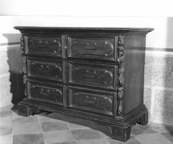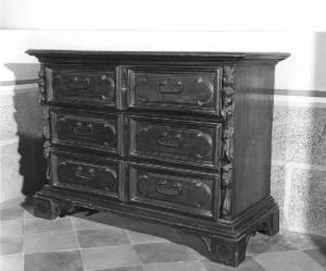 - NOTIZIE STORICO CRITICHE L'arredo presenta qualità formali e struttura più leggera rispetto agli altri due cassettoni stilisticamente molto simili tale da farlo ritenere opera di gusto ritardatario realizzata da bottega lombarda tra la fine del sec. XVII e inizio sec. XVIII. I caratteri formali e decorativi di questi esemplari sono comuni nella produzione lombarda del sec. XVII. Sono infatti caratteristici dell'epoca e della zona il carattere massiccio, la sobrietà delle decorazioni, il motivo intagliato con le teste di cherubino alato o con mascheroni e pendoni di frutta e terminazione a volute o a squama. Si vedano arredi lignei coevi nel coro di S. Maria presso S. Celso, la bussola e gli armadi della sacrestia di S. Vittore al Corpo, quelli di S. Maria della Passione e di S. Eustorgio , i confessionali, la credenza del battistero e gli armadi da sacrestia di S. Alessandro, in Milano. E inoltre molti esemplari ancora conservati nell'antica diocesi milanese ( si cfr. gli armadi della sagrestia della prepositurale di S. Nicolò di Lecco, della parrocchiale di Bellano e della parrocchiale di Ospedaletto Lodigiano ). E per l'arredo privato si veda il cassettone di una collezione privata di Azzate e quello conservato in Casa Cusani Confalonieri a Milano ( Alberici 1964 pp. 45-57 )