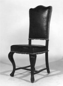 Sedie di massello di noce scurito, schienale liscio, rigido, sagomato nella parte posteriore, semplice sedile rettangolare, gambe anteriori curvate, posteriori rigide e semplicemente intagliate, unisce le gambe una traversa ad H, copertura di cuoio bruno con passamaneria, probabilmente pertinente.