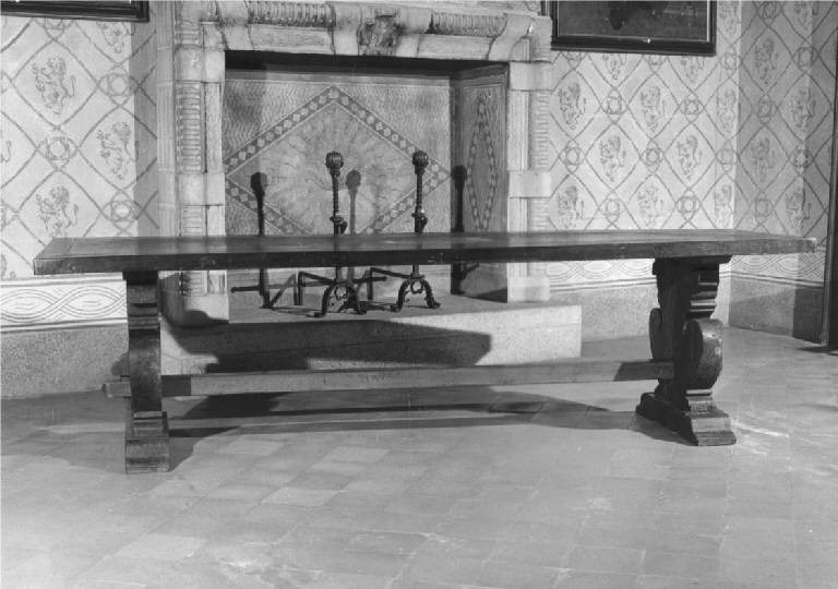 - NOTIZIE STORICO CRITICHE Tavolo conventuale realizzato nel sec. XVI probabilmente in Toscana come sembra dimostrare l'uso prevalente dell'intaglio, la struttura sobria e robustamente architettonica, i sostegni a "coppa di assi" riecheggianti la forma di un vaso, propri dell'area Toscana e del sec. XVI. Per confronti stilistici si veda un tavolo di una collezione privata a Firenze ( Pignatti 1951, p. 38 ) attribuito a bottega Toscana del sec. XVI; i vari esemplari conservati nelle Civiche Raccolte di Milano ( Rosa 1963, pp. 45-46 ); e in particolare i tavoli conservati nel Museo Horne di Firenze e della collezione An ADAC ( Tinti 1928, tavv. CXVII-CXVIII ). Presenta rimaneggiature e aggiunte eseguite probabilmente nel sec. XX