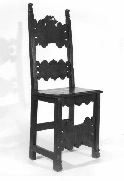 - NOTIZIE STORICO CRITICHE Numerosi esemplari di fratina coevi e stilisticamente simili sono conservati nella raccolta ( cfr. ). La "fratina" è una sedia ideata e diffusa anzitutto in Toscana al principio del Seicento come derivazione della comune sedia cinquecentesca. Anche in Lombardia nel sec. XVII, soprattutto nella zona bergamasca e bresciana, la produzione di questo tipo di sedia è abbondante ed in genere denota gusto e abilità per l'intaglio ad intarsio. Anche questo esemplare pur nella sua semplicità di struttura e di decorazione è opera secentesca di produzione lombarda. Tuttavia l'impianto architettonico è ancora cinquecentesco con gli elementi verticali paralleli e leggermente divaricati, il sedile piuttosto alto e gli intagli piatti e frastagliati. Per confronti stilistici si veda le sedie della raccolta di Palazzo Bagatti Valsecchi a Milano, ( Toesca 1918, p. 22 ), del Museo Nazionale del Bargello di Firenze ( Collobi R. 1951, p. 96 ) e quelli delle Civiche Raccolte del Castello Sforzesco di Milano, attribuite alla Lombardia e datate al sec. XVII, che tuttavia presentano un'esecuzione più ricca e gustosa ( Rosa 1963, pp. 67-70 ). Si confrontino inoltre gli esempi lombardi del sec. XVII del Schlossmuseum di Berlino ( Hoffmann 1938, p. 33 f. 70 ) e del Kunsthandw di Francoforte sul Meno ( Meister e Jedding 1958, n. 166 )
