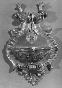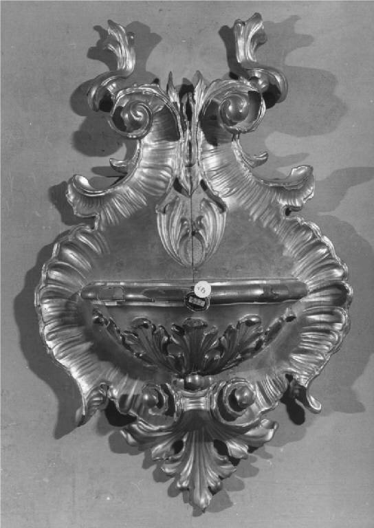 Mensola a muro di legno dolce, forma mistilinea, ornata con motivo decorativo "a pelacette", foglie d'acanto, volute.
