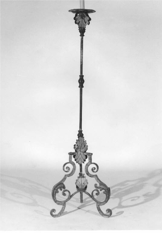 Torciere poggianti su base mistilinea, ornata con volute e foglie d'acanto, dipinte di giallo e rosso, riprese sul portacenere liscio, asta ornata con decorazioni tornite di metallo bruno.