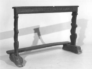 Semplice inginocchiatoio a giorno in massello di noce, il piano liscio leggermente aggettante appoggia su due robusti sostegni intagliati, terminanti su due piedi.