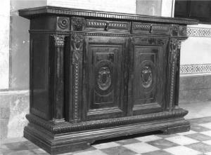 - NOTIZIE STORICO CRITICHE La credenza di massiccia struttura è stata realizzata in stile eclettico con ricchezza di elementi ornamentali ripresi da modelli tipicamente toscani della metà del cinquecento ( cfr. il trionfo dell'intaglio; le decorazioni delle lesene; le colonne ai lati, la base sporgente; le bacellature ). Per confronti stilistici su modelli originali si veda una credenza molto simile a questa, attribuita alla seconda metà del sec. XVI della Coll. Horne di Firenze ( Gregori 1979, p. 42 ) e inoltre altre due, sempre della stessa epoca, la prima di una collezione privata fiorentina e la seconda conservata a Palazzo Vecchio di Firenze ( Tinti 1928, tav. CLIX, CLXX )